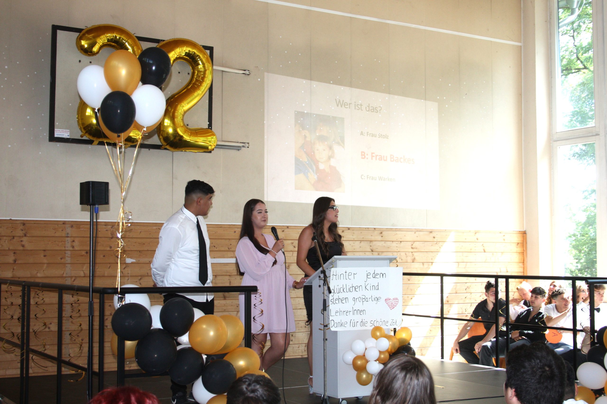Zum Unterhaltungsprogramm, das die Schüler zusammen gestellt hatten, gehörte der südamerikanischer Rumba – Tanz „Bachata“ der Klasse 9a, ein lustiges Quiz der Klasse 10a, bei dem die Abgangsklassen erraten mussten, wer sich hinter den gezeigten Baby- und Kinderfotos der Lehrer/innen versteckte und eine unterhaltsame Bilder – Show der verschiedenen Fahrten und Unternehmungen in der vergangenen Schulzeit.