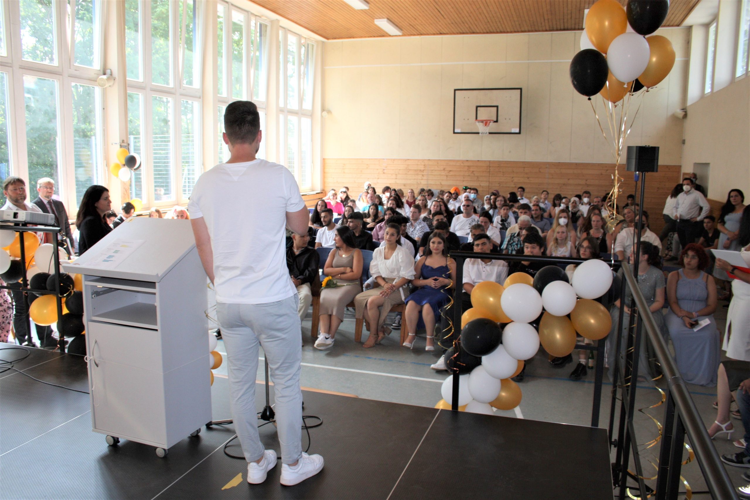 Schulleiter Michael Klepper erinnerte in seiner Rede an die Schüler/innen und Gäste an die zurückliegende schwierige Schulzeit mit Wechselunterricht, Homeschooling, Videokonferenzen oder der Maskenpflicht unter Corona – Bedingungen Mit dem Erreichen der Abschlüsse, so Klepper an die Schüler, „habt ihr eure Sache dennoch alle richtig gut gemacht!“ Er dankte allen Lehrern/innen der vergangenen Schuljahre, aber auch den Eltern für die Zusammenarbeit mit dem Ziel, einen erfolgreichen Abschluss für die Schüler zu erreichen. Ein wichtiges Ziel auf dem ganz persönlichen Lebensweg sei damit erreicht und neue Wege werden jetzt zu gehen sein, ob in weiterführenden Schulen oder einer Berufsausbildung.